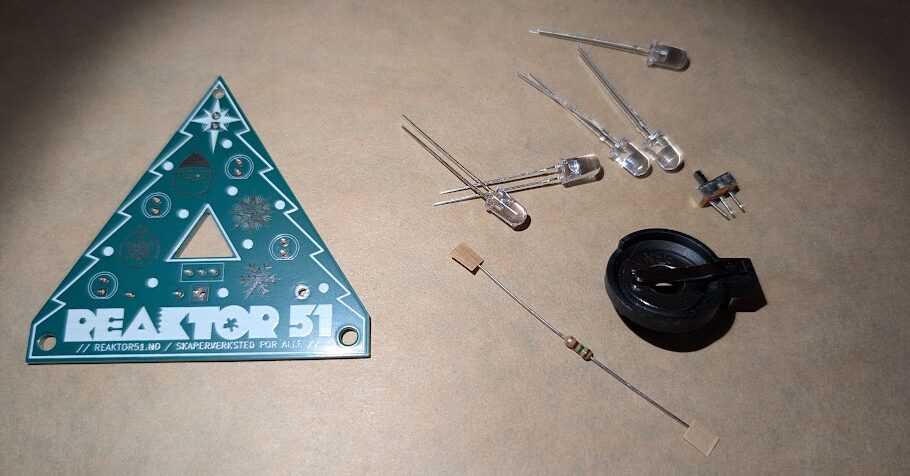 I denne esken finner du alt du trenger for å bygge ditt eget lysende juletre – bortsett fra CR2032-batteriet, som du må skaffe selv.